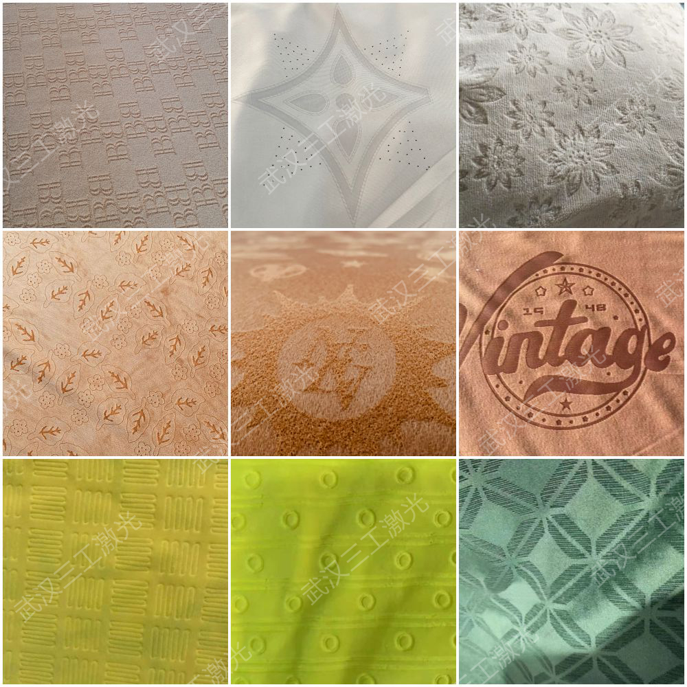 激光燒花,通過穩定的激光能量控制和精確地掃描系統的配合,在布料表面進行熱加工,形成深淺不一的各種圖形。主要適用于面料紡織染色后整理,例如應用在家紡、鞋材、玩具上面的經編短絨布以及應用在服裝面料上面的梭織布、牛仔布的雕花,應用在內衣、運動服、健身衣上面的緯編針織布的雕花和打孔。
