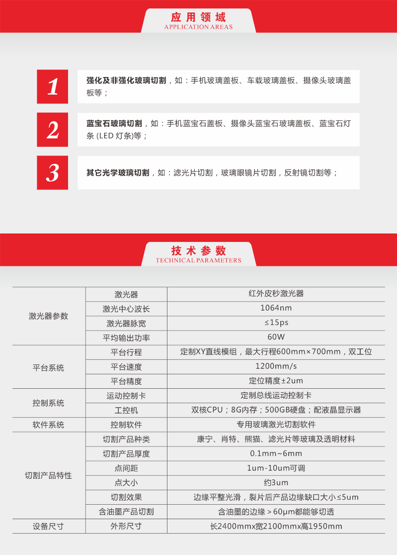 在消費類3C電子行業,隨著消費者對產品高質量的追求,促使供應商對手機屏、攝像 頭玻璃類蓋板及屏幕類脆性材料產品加工制造上提出更高的要求,如切割強度高、崩 邊小、生產效率高、成本低、行業領先的工藝等高技術加工要求,而傳統的CNC加工 存在切削液對環鏡污染,鉆頭等刀具磨損,加工效率低下,需要更多的設備、人力及 更大的場地面積,直接導致成本超高。我司研發生產的玻璃激光切割裂片機一次性解決了以上所有問題。